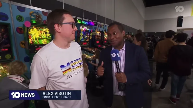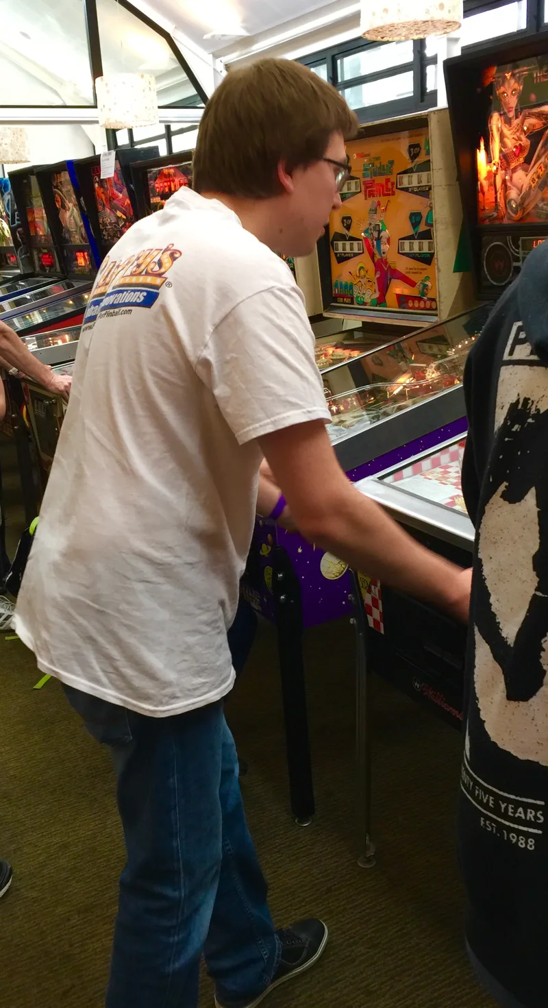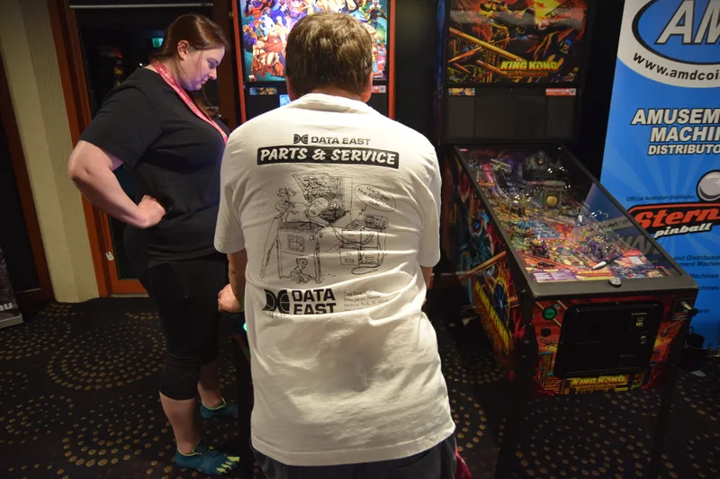 I was going through my Data East era at this point in my life, having just finished my Teenage Mutant Ninja Turtles (Data East, 1991) restoration, and having acquired Maverick (Data East, 1994). So, what better way to advertise my new obsession than a shirt? Since there were no commercially available Data East shirts available, I made my own! The front side logo was the logo used by Data East in their video games. I love the horizon effect. "We've Got It All" was one of their taglines in the early 1990s. The rear side included a sketch from many Data East technical bulletins and documents at the time, featuring gremlins attacking a pinball machine. I found the best copy of the sketch I could, and did a little Photoshop work to clean it up. I added the Data East contact details and the "Parts & Service" text for authenticity. It looks legit! Plus, I was wearing it when I got interviewed by 10 News at Collectfest!