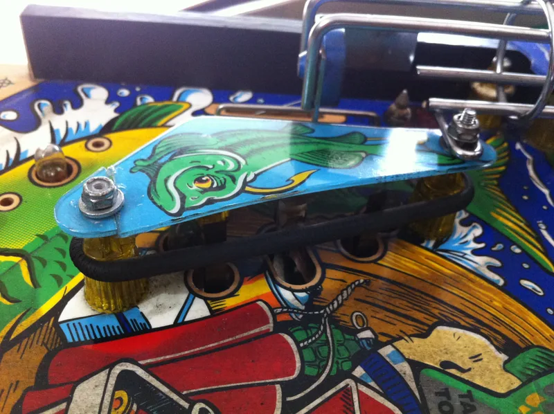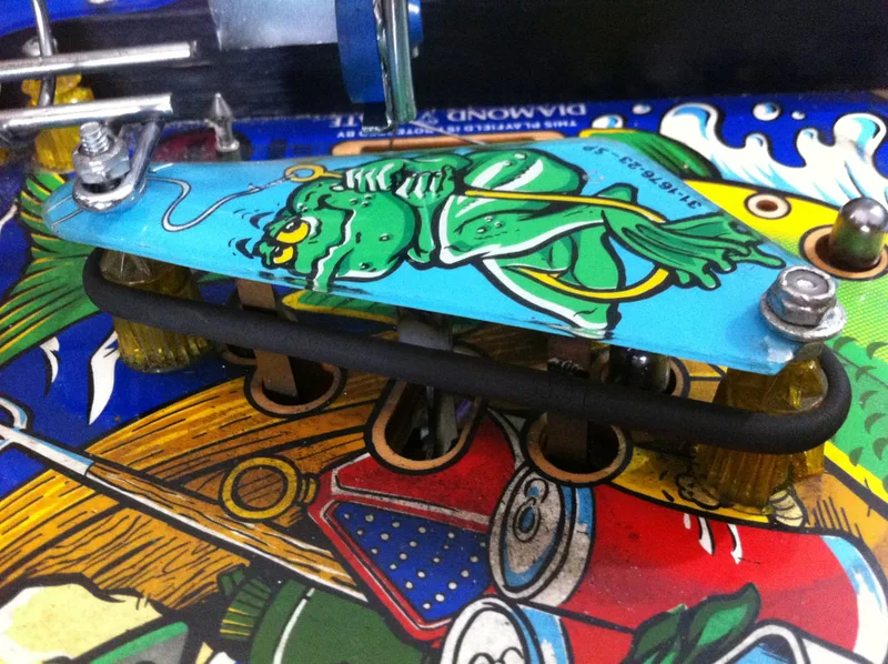 I replaced the rubber post sleeves with Cliffy post sleeves but I used a mixture of colours. For the two posts holding the captive ball in place, I used light blue sleeves to match the ramp flap decal. For the two posts on either side of the ramp flap, I used dark blue sleeves to match the water artwork on the playfield. Finally, I installed a green sleeve on the post just below the Caster's Club as the playfield is green in this area. I don't like to mix and match colours much on a game, but I think they work really nicely on Fish Tales, which is a colourful game. To match the colours of the fish by the flippers, the yellow flipper bats were cleaned up and then fitted with green Super-Bands.