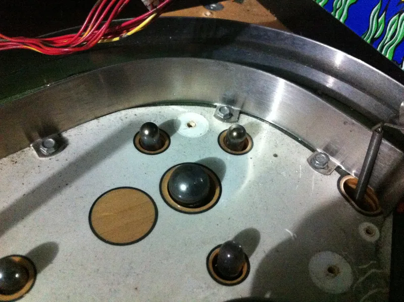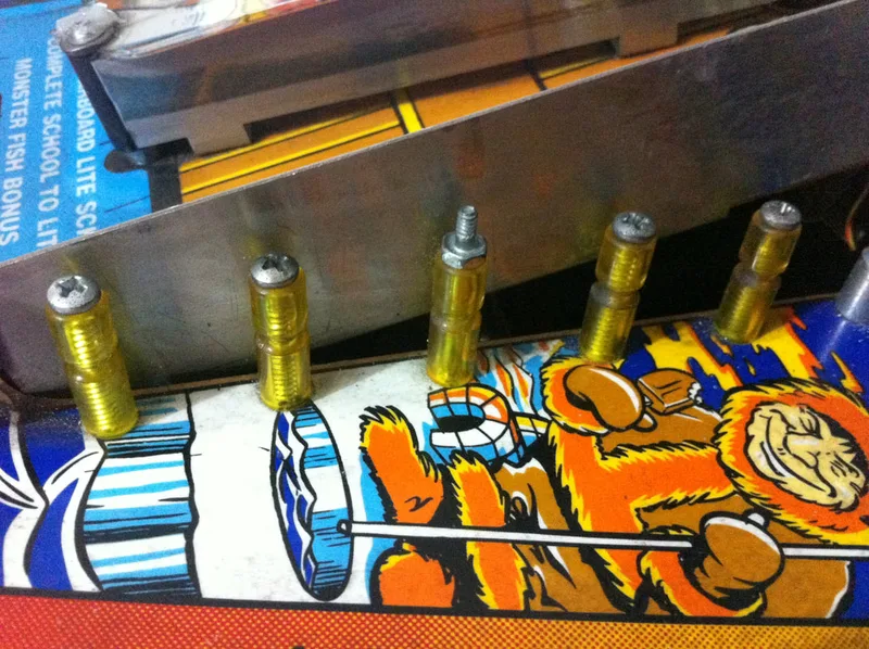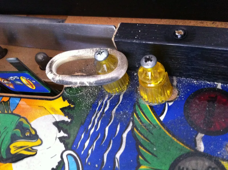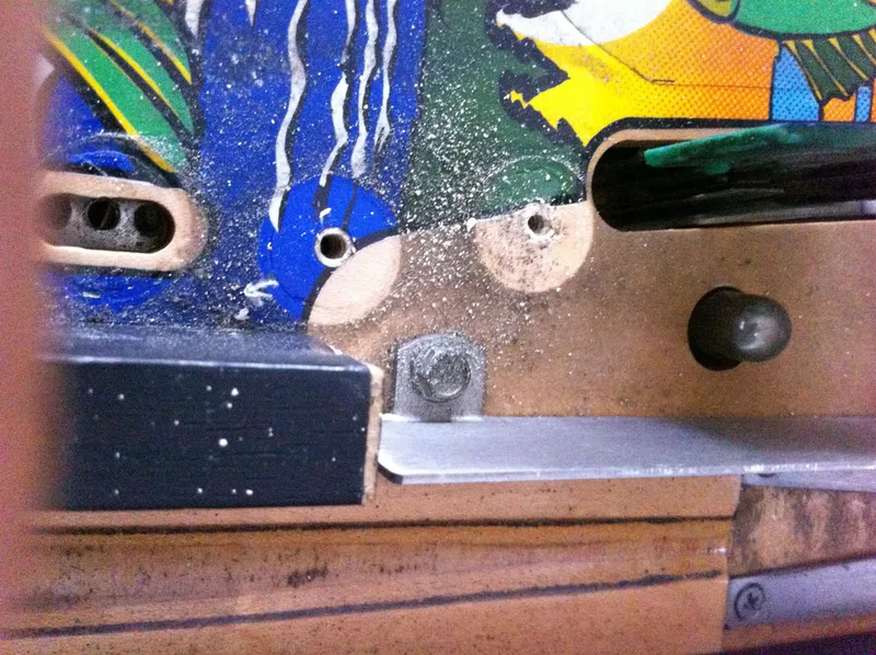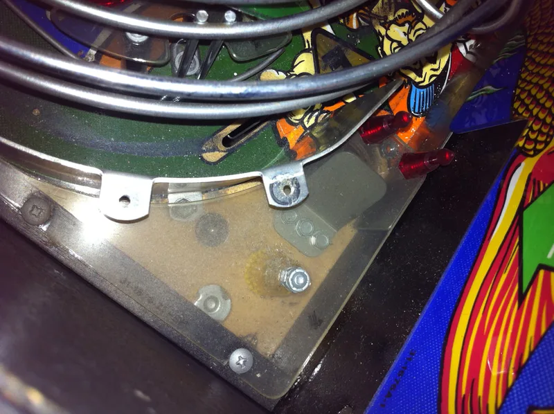 All of these vulnerable plastics should be protected by plastic washers to absorb any ball hits. I installed two on the bottom edge of the captive ball plastic, and one on the bottom edge of the thin plastic to the right of the boat. These should safeguard against any stray airballs in future.