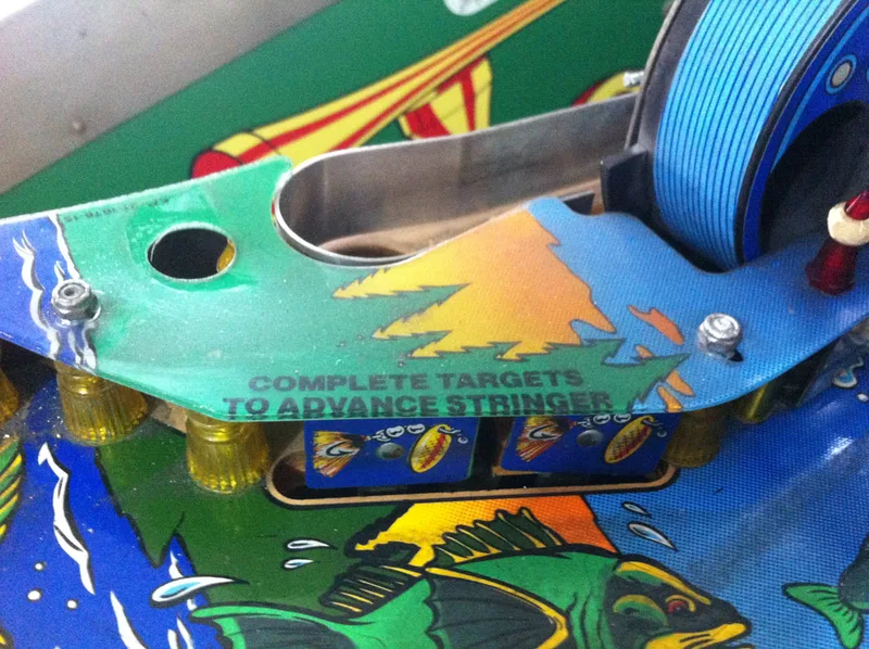Fish Tales is a simple game, playfield-wise, and there's not really much to take apart. The trickiest thing is probably the boat ramp in the centre of the playfield. This needs to be loosened from underneath the playfield at the top (one nut) and bottom (supporting plate with multiple screws). Then it can be lifted up or down out of the playfield.