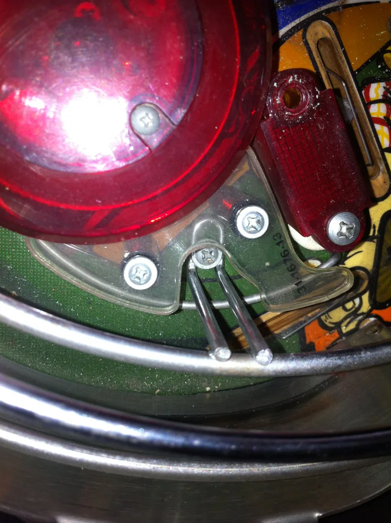 The switch actuator on my game had been hacked together from a couple of different switch blades, and then soldered together. The blades were loose and would move around a lot when pushed on. Moreover, the switch actually required a lot of force to depress, which meant that the switch would sometimes not be triggered even if there was a ball sitting on top of it. I replaced the entire switch with a similar microswitch with an intact actuator blade and which did not require as much force to activate. The one I used is actually designed for outholes (part no. 5647-12133-12) but works just as well. The catapult now fires balls out more quickly than before, as it should! It also makes multiball a lot harder to manage as a result - as it should be!