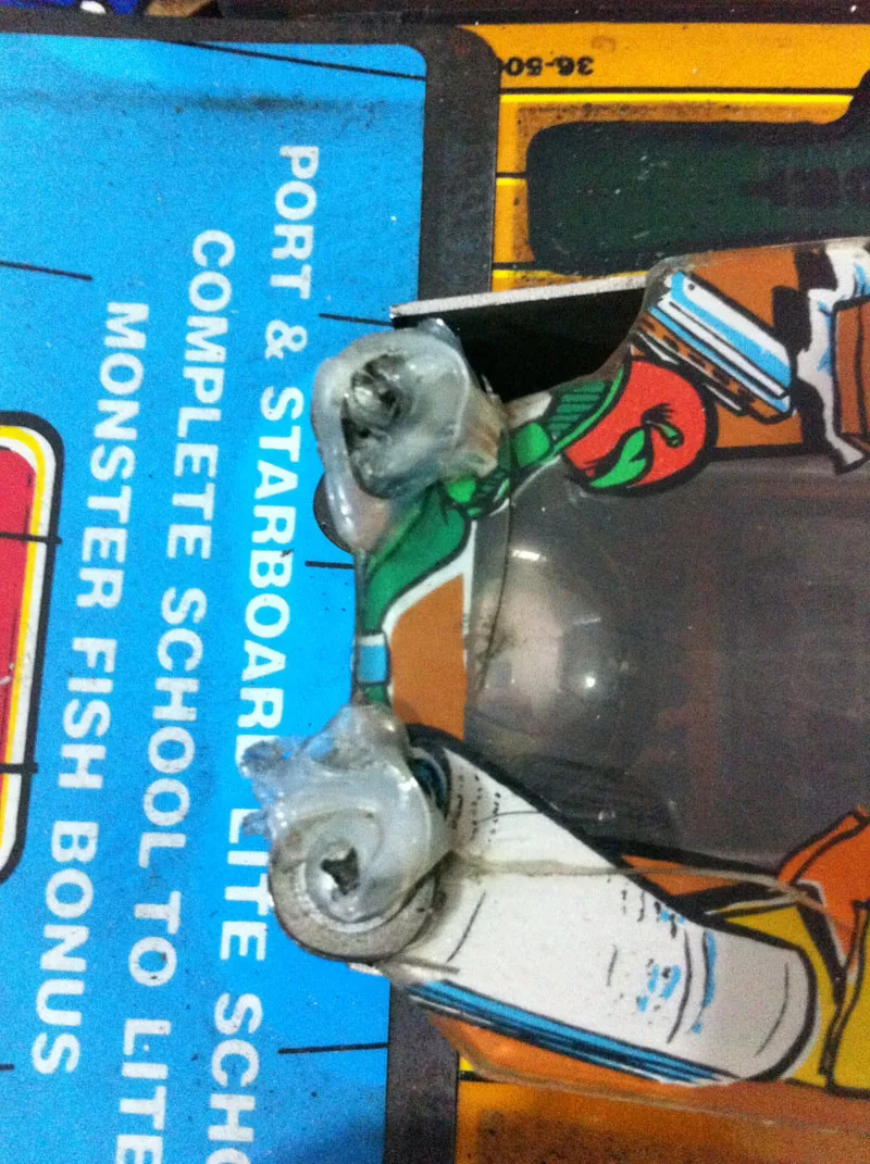 Both of my machines had broken captive ball plastics. One was even covered with a mess of hot glue, presumably to keep the screws attached to it, as the screw holes were no longer there. The plastic on the left of the boat ramp (part no. 31-1676-11) had its bottom corner snapped off on one of the machines. And finally, the Caster's Club plastic (part no. 31-1676-7) looked to have been smashed by a ball as it had a perfect ball-shaped chunk removed from the bottom edge of it. One of the inlane plastics (part no. 31-1676-3) had cracks in it from over-tightening. And, of course, three out of the four slingshots (part no. 31-1676-23 and 31-1676-1) were also chipped. Fish Tales is a plastics graveyard!