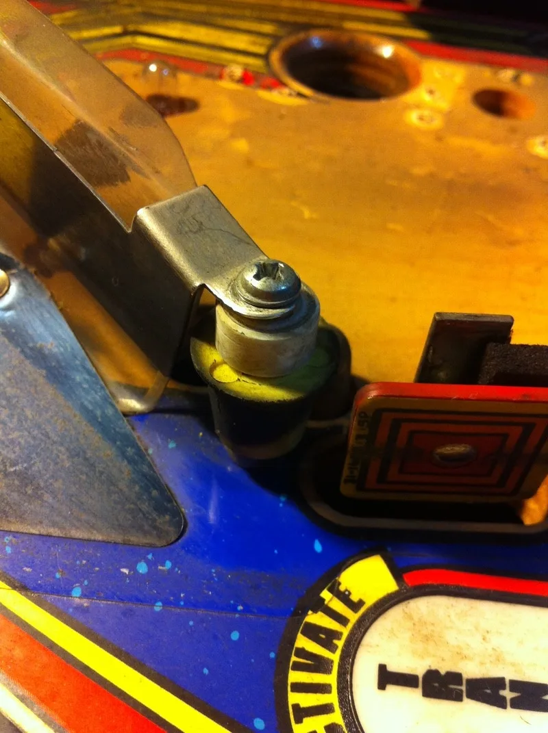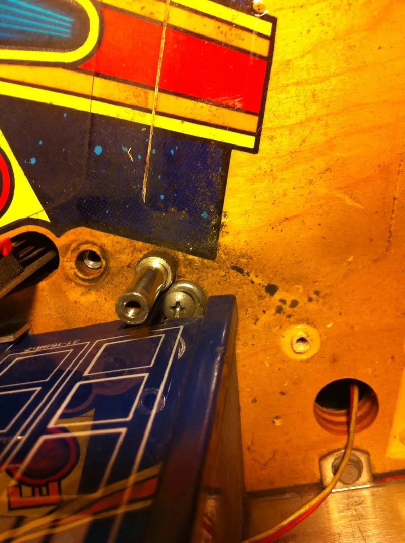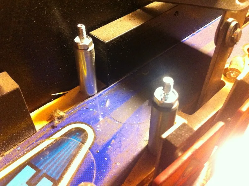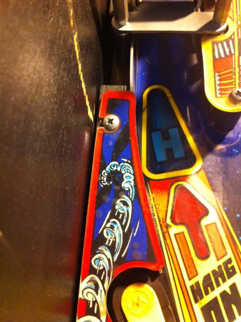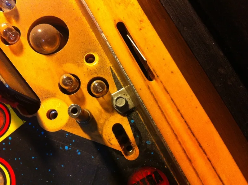 This was an extra star post that wasn't meant to be there. It was installed above and between the right inlane and outlane. Unlike the centre post, I actually understood why this one was installed. The ball would often bounce off the slingshot rubber when it was kicked out of the TARDIS upkicker. This would result in it draining down the right outlane about 20% of the time. This is something that needs fixing, for sure. But all you need to do is adjust the wireform ramp attached to the slingshot and move it left or right! Installing a post is hamfisted and totally unnecessary. There is even a page in the manual that mentions this problem specifically and instructs you on how to adjust the wireform to fix it!