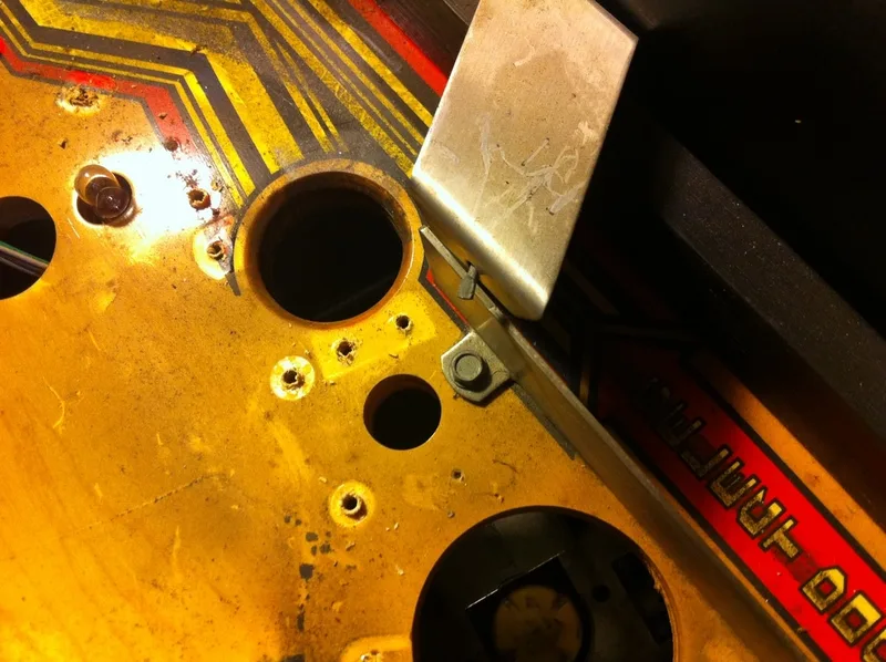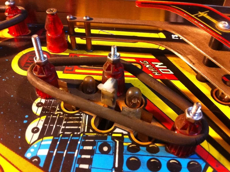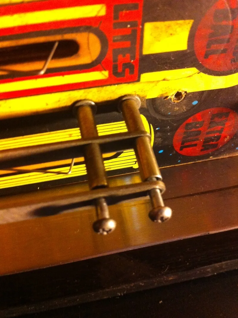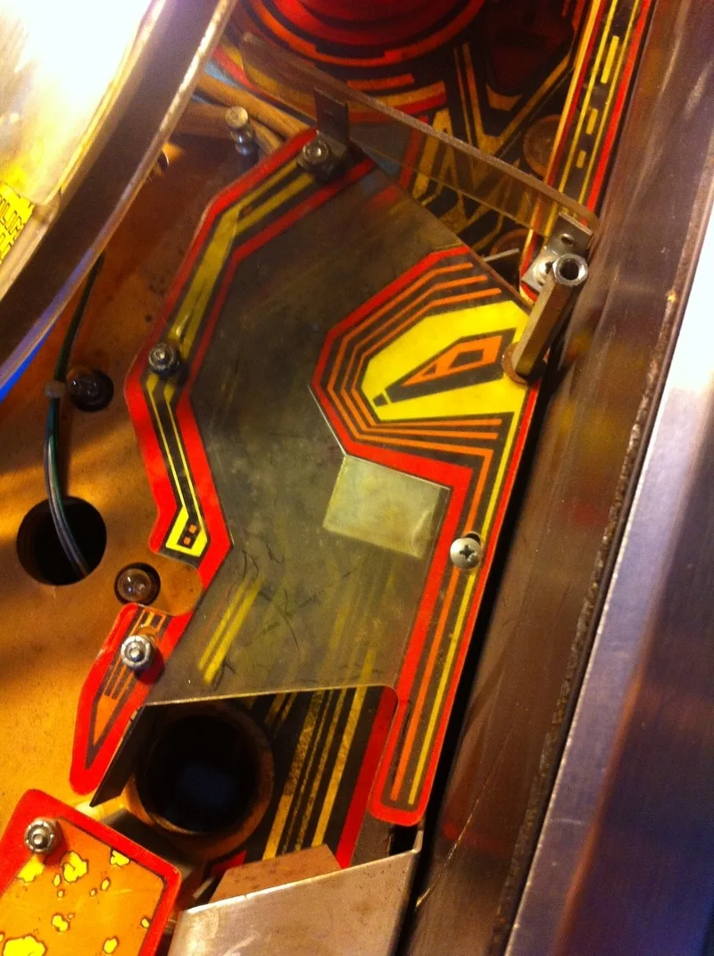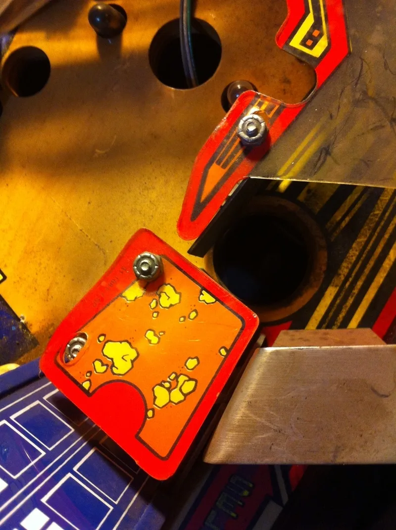 This was an extra star post that wasn't meant to be there. It was installed above and between the right inlane and outlane. Unlike the centre post, I actually understood why this one was installed. The ball would often bounce off the slingshot rubber when it was kicked out of the TARDIS upkicker. This would result in it draining down the right outlane about 20% of the time. This is something that needs fixing, for sure. But all you need to do is adjust the wireform ramp attached to the slingshot and move it left or right! Installing a post is hamfisted and totally unnecessary. There is even a page in the manual that mentions this problem specifically and instructs you on how to adjust the wireform to fix it!