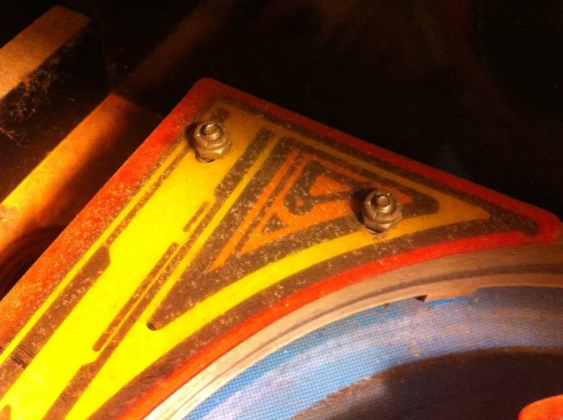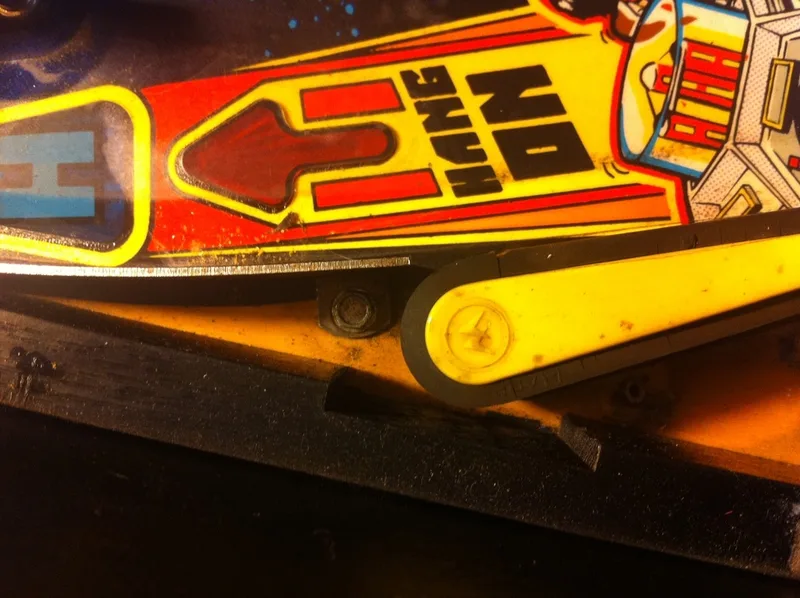 I followed the same procedure to fix the hole created by the star post as I did to repair the centre post hole. The repair went pretty much the same way, the only difference being that I needed to paint a small section yellow to match what was on the playfield. Fiona did an excellent colour match on this one using Createx opaque yellow with a dab of opaque red for darkness. Then, some opaque black for the edge. Unfortunately, I forgot to snap an 'after' picture.