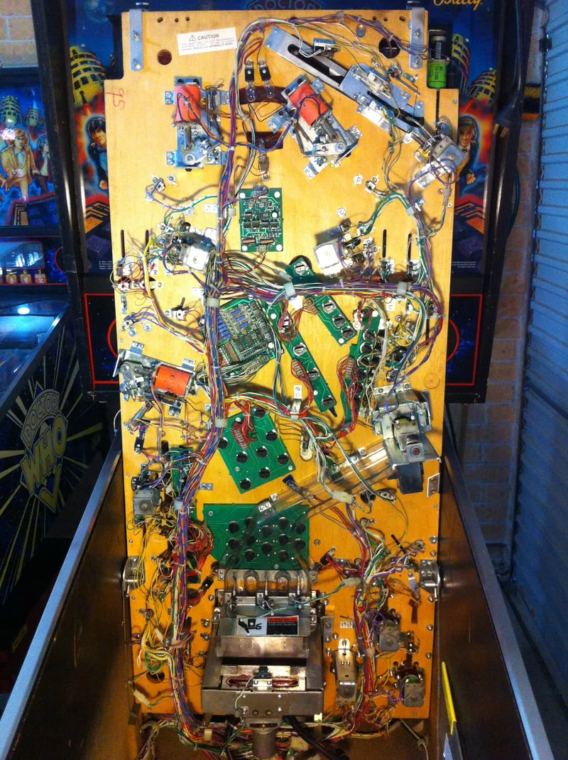 After my World Cup Soccer restoration, I was rearing to go for another. Doctor Who (Bally, 1992), was another machine I had bought at the same time as World Cup Soccer. I had a lot of mixed feelings about Doctor Who as a pinball machine. While I wasn't much of a fan of the TV show or other Doctor Who media, I hadn't played the pinball machine much before and many pinheads insist that it is a really cool game. The mini playfield is the main feature on Doctor Who. It's a section of playfield that rises and sinks to reveal objectives to hit; it is very similar in style to the ball lock area on Jack-Bot (Williams, 1995). Doctor Who definitely looked like more of a technical challenge so I decided to sink my teeth into it and see how far I could get.