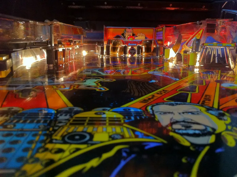 One thing I found particularly interesting was how nicely you could polish the playfield using Novus 2. I used Novus 2 to clean and polish the repair area after using some slightly more aggressive sandpaper to level the wood filler. I was surprised at how nicely you could actually polish the clearcoat up. From the factory, the coat is quite rough, but after some polishing, it shines up like a mirror. Below is what it looked like on an undamaged part of the playfield compared to the repair area. Shiny! If you see your playfield get this shiny when polishing it, exercise caution. You will soon eat through the clearcoat's full thickness and damage the paint.