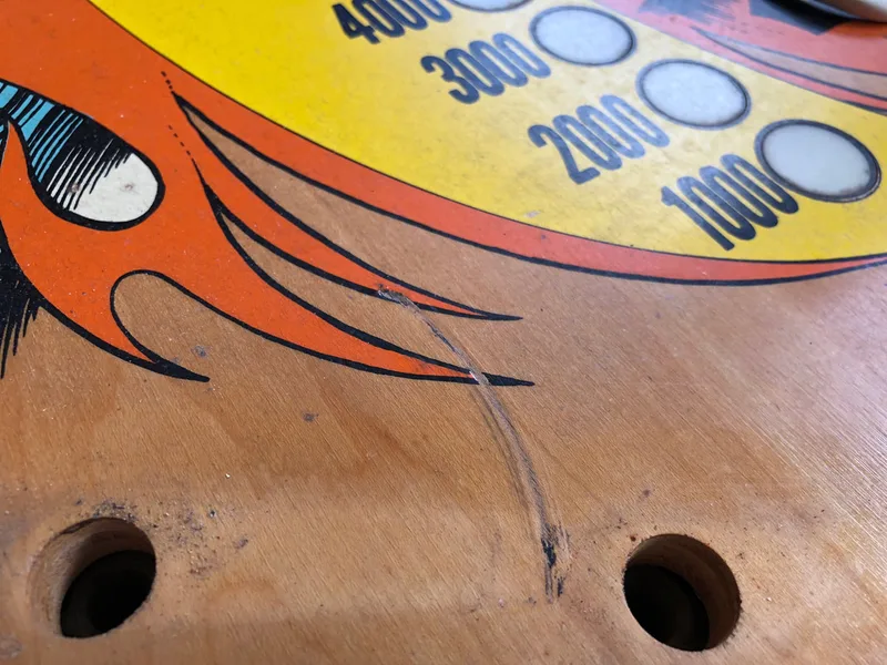 Flipper gouge mark on the playfield.