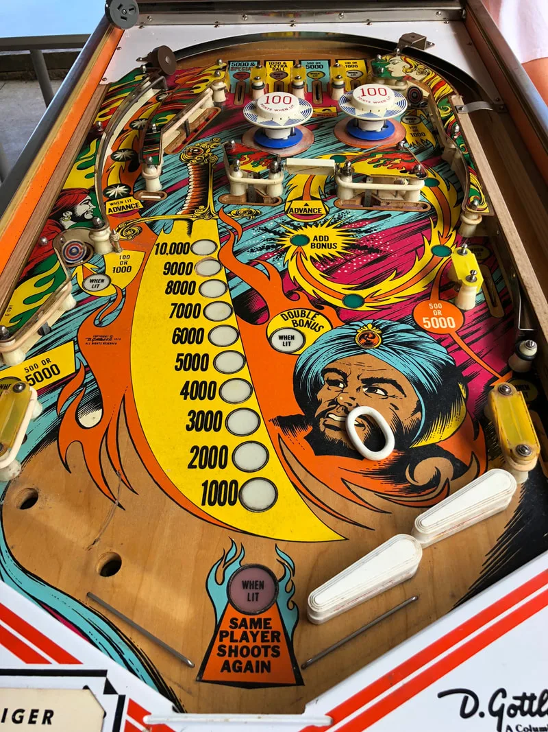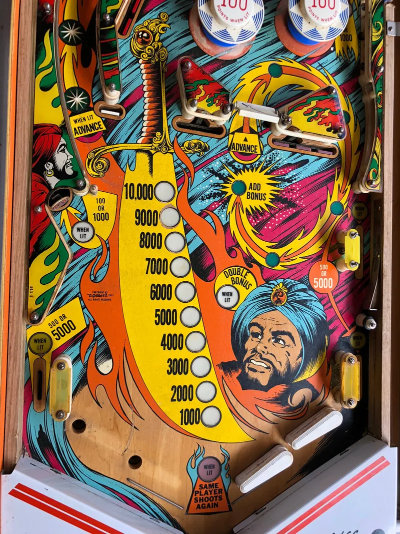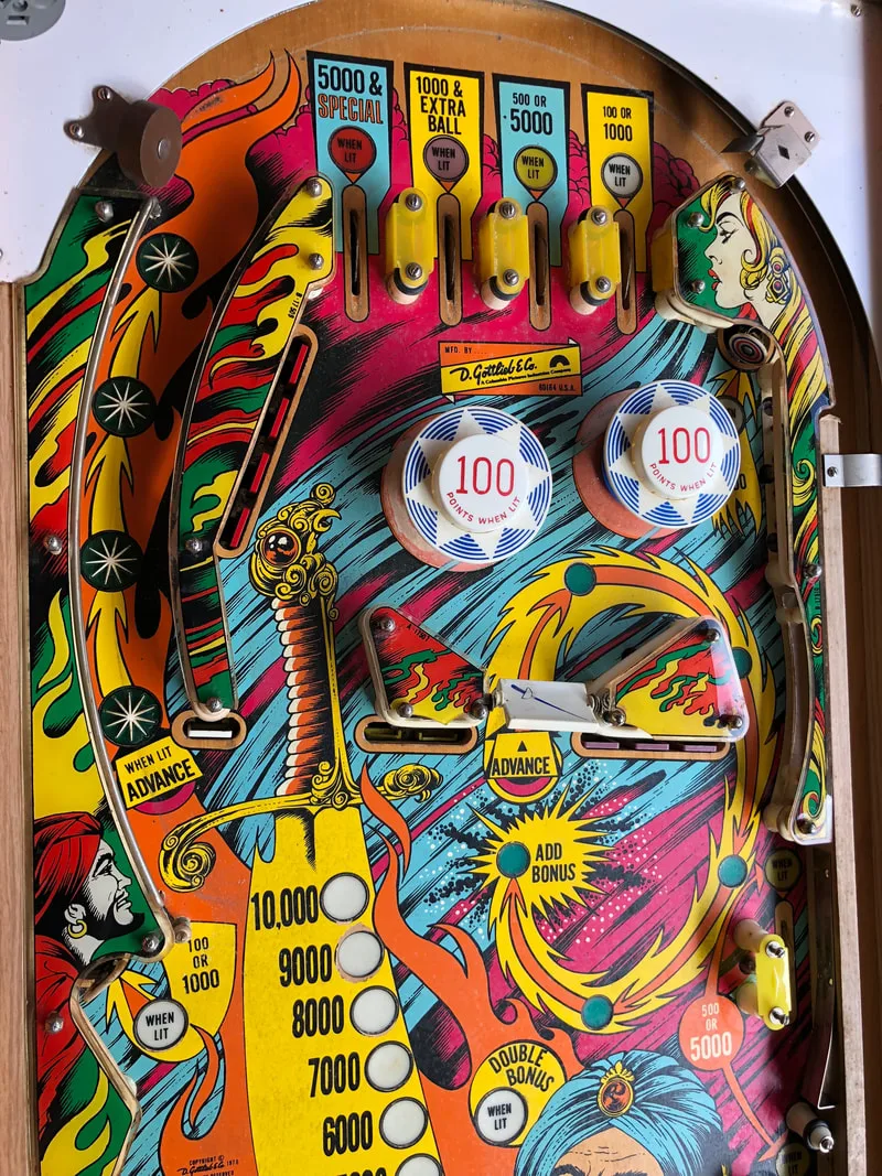 The main reason I wanted to install a protector was to level out the inserts on the playfield. Many of them were slightly sunken or cupped from age, heat stress, and shrinkage. So I could either pop out every insert, flatten it, smooth it, and fill it, or I could just install a playfield protector and achieve the same effect. The playfield protector was the easier option! It took me a while to find a playfield protector because I was searching for one for Eye of the Tiger specifically. But remember: Gottlieb made far more Sinbad (four-player solid state) games than Eye of the Tiger. And they both have exactly the same playfield, as the silkscreened game numbers on the playfield show.