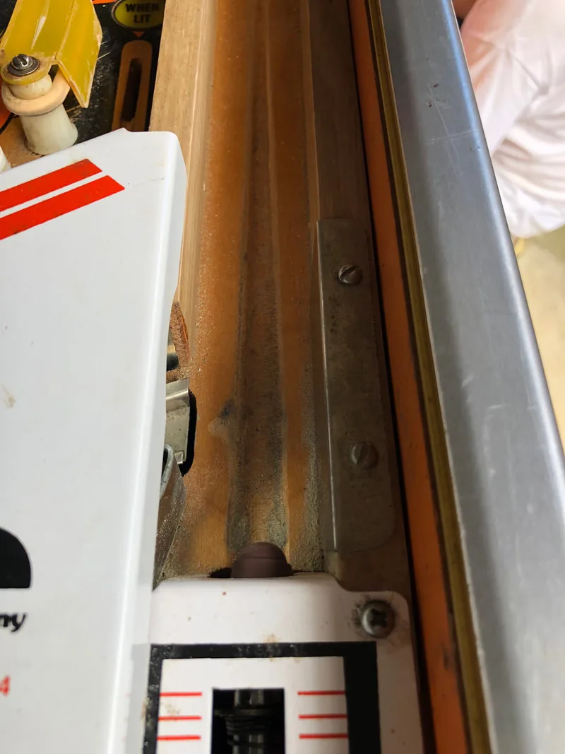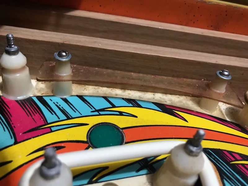 I have also seen a couple of games where the plastic on the right edge of the playfield is cracked or chipped at the bottom edge. Again, balls can hit the post in this area and travel upwards to crack the plastic, so a washer in this spot is a good idea, too.