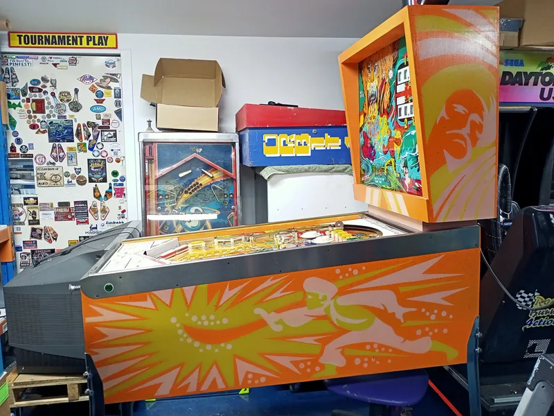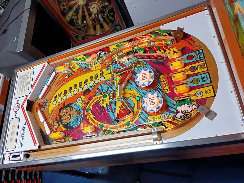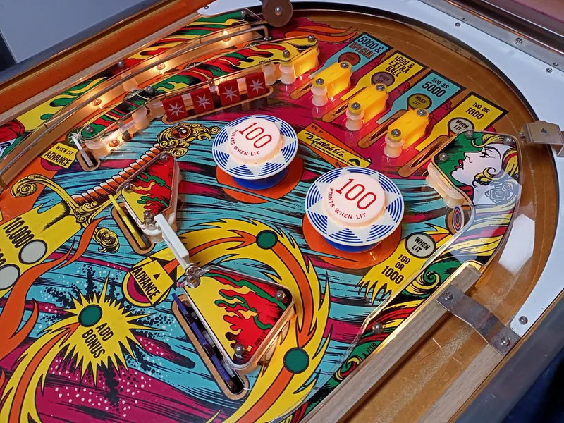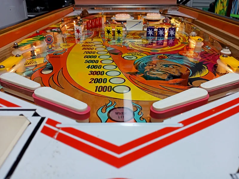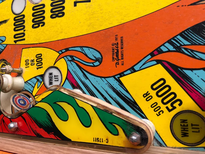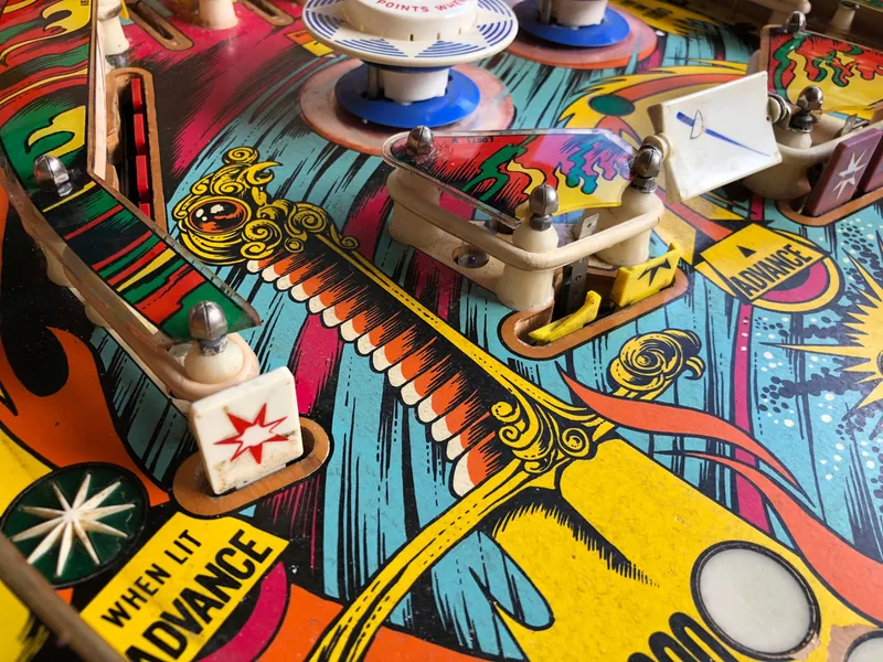- Playfield artwork in average condition. Some inserts sunken. Some wear to insert and pop bumper edges.