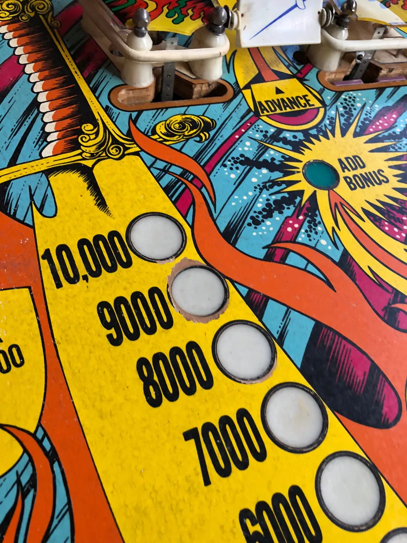 Some patches of paint were missing around the bonus inserts. The 9000 insert was the most affected, with only minor bits of paint removed from the 8000 and 10,000 inserts. These inserts are a little sunken from age, heat stress, and material shrinkage. Therefore the ball tends to bounce around a little when rolling over them. The uneven surface results in wear where the ball gets pushed upwards, on either side of the 9000 insert. The colours here are relatively easy to match; just yellow and black. You'll need a steady hand here to get the key lines around the inserts just right.