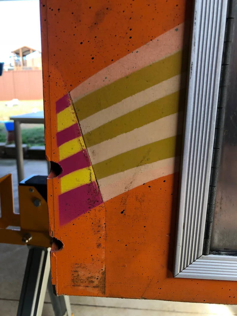 There was some significant wear around the pop bumpers. These pop bumpers had Mylar platters surrounding them to prevent exactly the type of wear that had occurred. The problem was that the old Mylar had dried, lifted, and was basically acting as sandpaper every time a ball ran over it, causing big patches of paint to be lifted from the playfield. I removed the Mylar patches and gave the area a clean. Luckily the colours here are quite simple; just some orange, teal and black. Unfortunately most of the great touch-up work is covered by the pop bumper skirts when they are reinstalled!