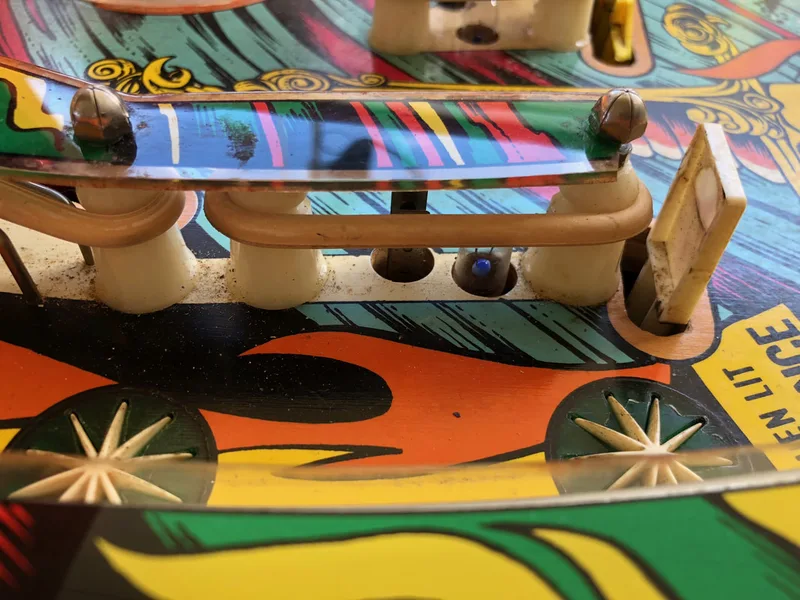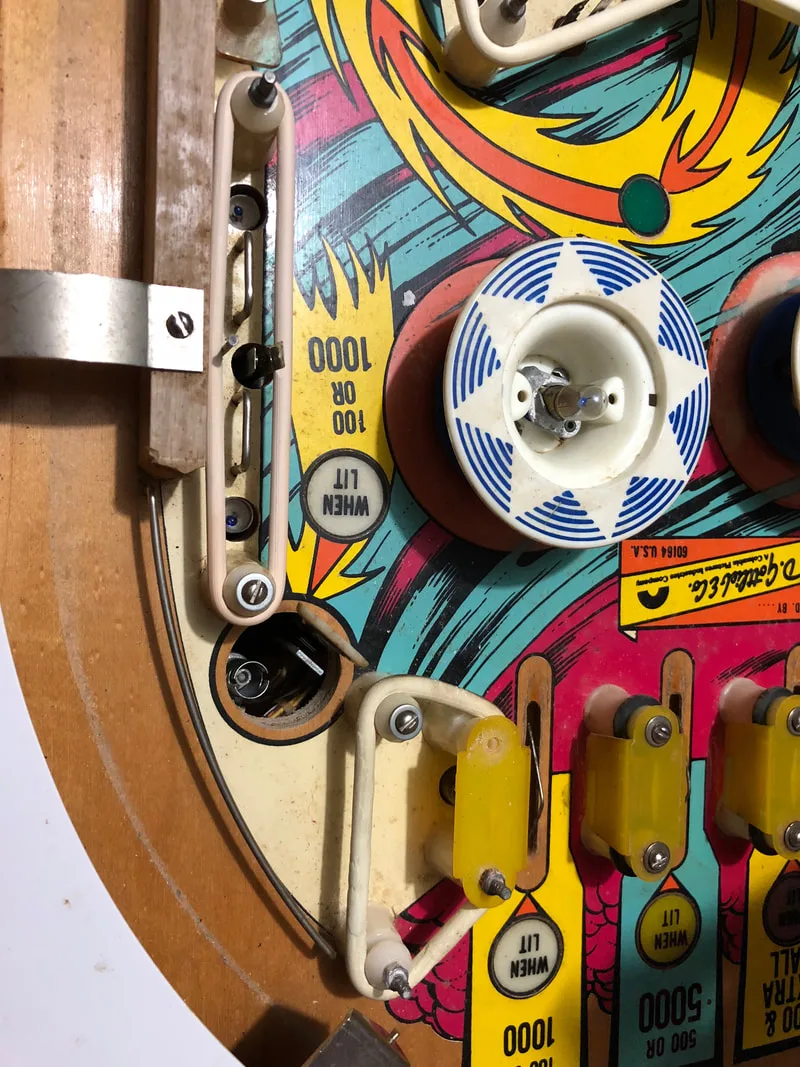 Ultimately, there were two lamps which I ended up changing to LEDs instead of the traditional incandescent. These were the two lamps directly to the right of the pop bumpers, behind a rubber ring. The rubber ring is the only protection these lamps have from the ball, which can hit them at high speed when deflected by the pop bumper. The mounting holes for the lamps are also cut very close to the ball area. As a result, these lamps get smashed quite often, as occurred in approximately the tenth game I played once I finished this restoration! The LEDs do look a little weird when the rest of the machine is fitted out with incandescent globes, but I prefer this to having to clean out broken glass from the playfield.