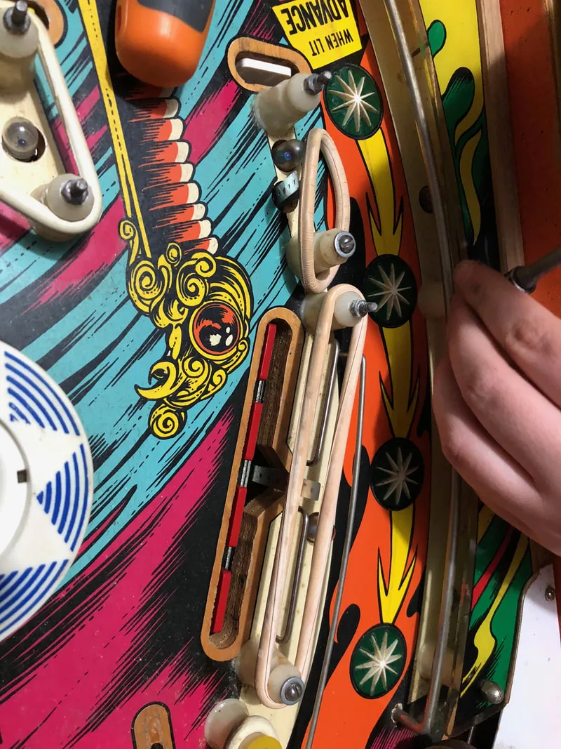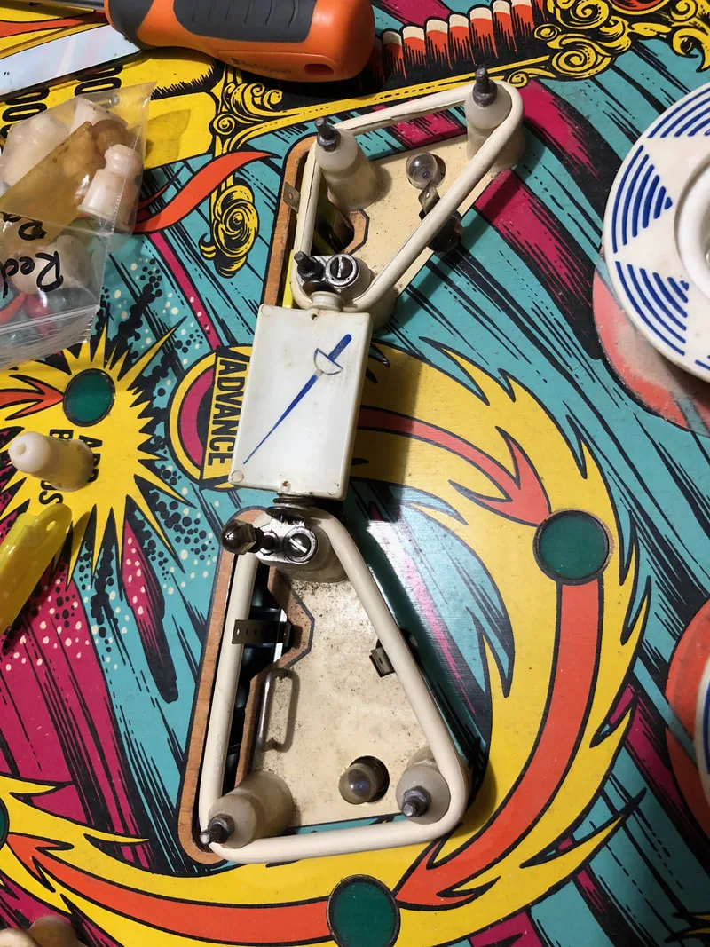 There's not much to reassembly of most EM games apart from the individual mechanisms under the playfield. Eye of the Tiger doesn't actually have many complex mechanisms like other EMs do. Varitargets and rototargets come to mind as mechanisms that can be a nightmare to reassemble and adjust. Eye of the Tiger just has drop targets, and if you take the entire assembly apart and clean it in one go (unlike what I did!) you'll have it back together in no time. The pop bumpers also get a good workout on Eye of the Tiger so be sure to rebuild them, too.