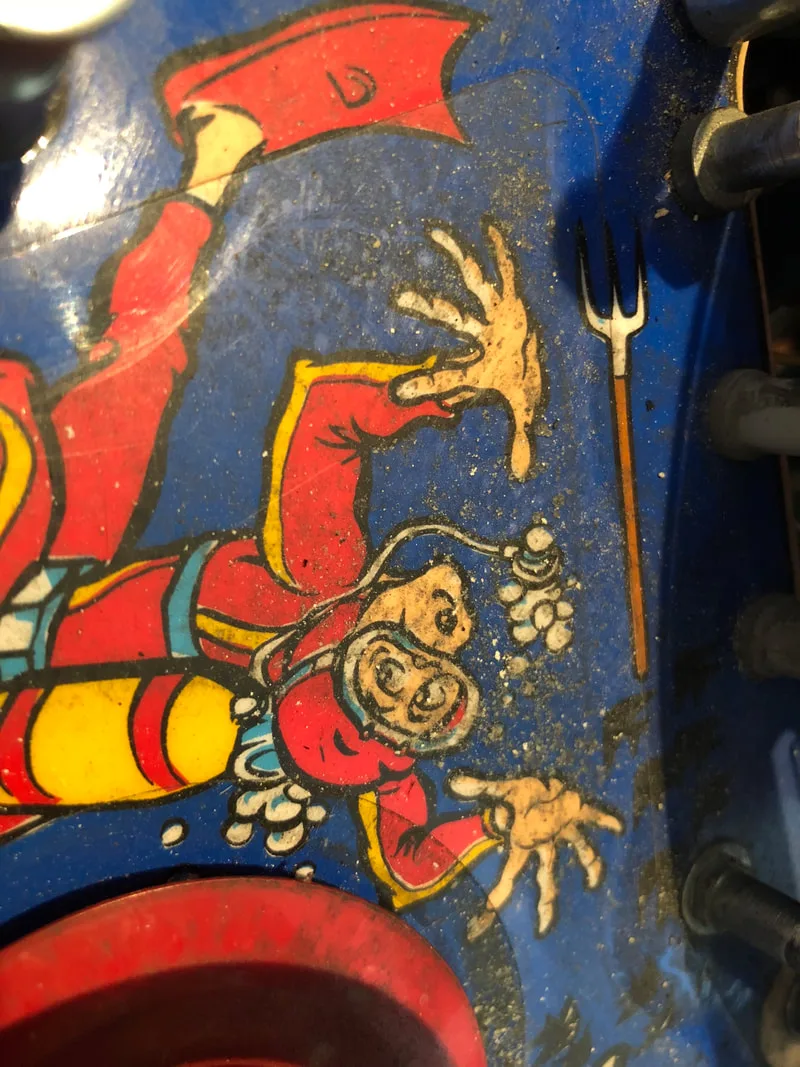 I will reiterate what I said in my previous two Fish Tales restorations - I love working on Fish Tales! The simple playfield layout and the simple mechanisms make it easy to disassemble and service. The images below give a rough idea of the condition that the machine was in. The playfield looked to be in good condition under the dirt, with some big, grimy build-ups around the pop bumpers.