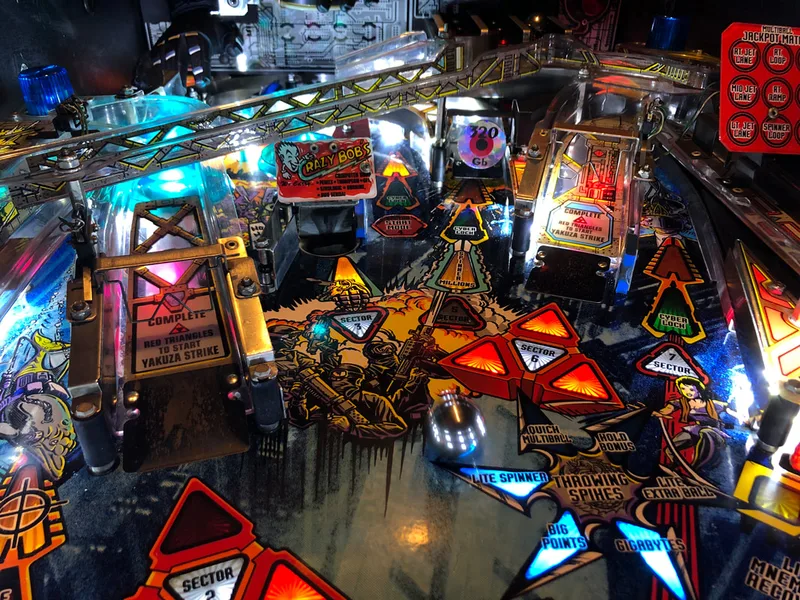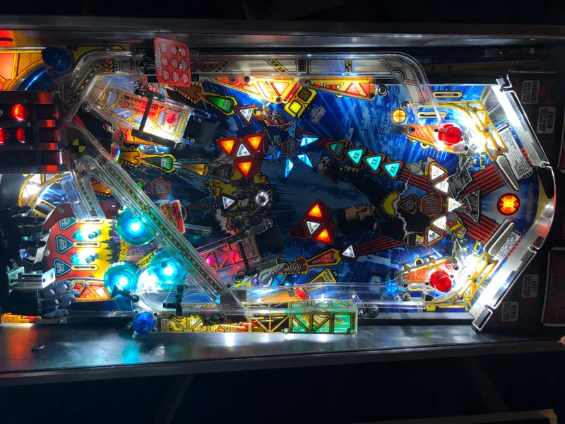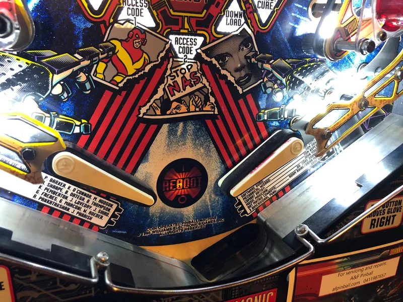 First, a fully intact Sector 7 playfield plastic! Plus, the Mnemonic Recovery standup target underneath this plastic was also completely intact. I was extra jealous of these as the plastic on my game is missing entirely, and the standup target face is broken.