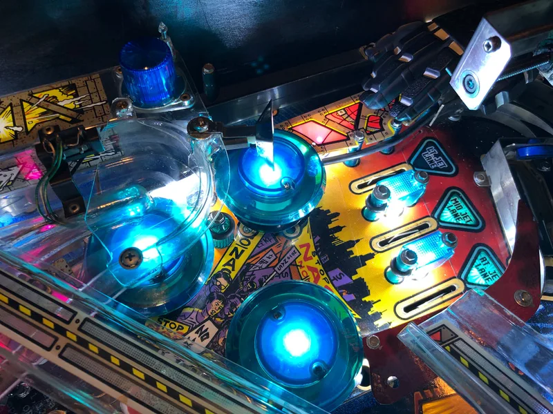 Of course, the pop bumper rebuilds also included new wafers/skirts, and two new bumper caps to replace ones with broken screw holes. The pop bumpers on Johnny Mnemonic always look great after a rebuild; I love the teal colour and it's a shame it wasn't used on more games. These teal caps are only used on Johnny Mnemonic and World Cup Soccer (Bally, 1994). If possible, use caps with raised tops (part no. 03-9030-25, RTBB, PSPA) as opposed to the lower-top ones used on Cactus Canyon (part no. 03-8254-25).