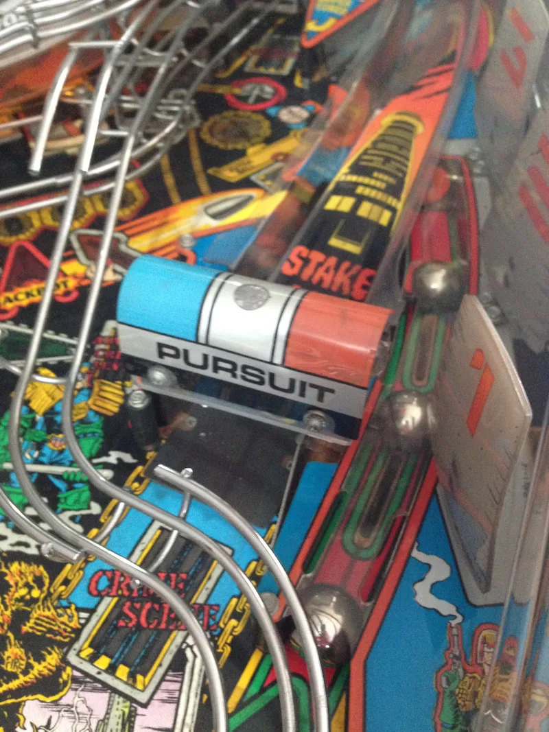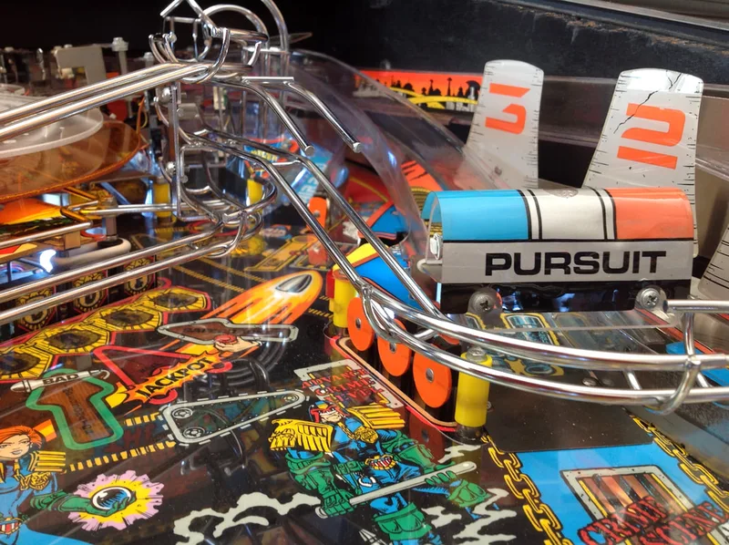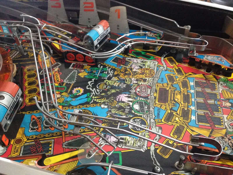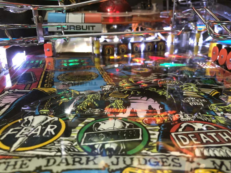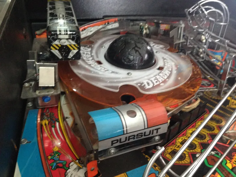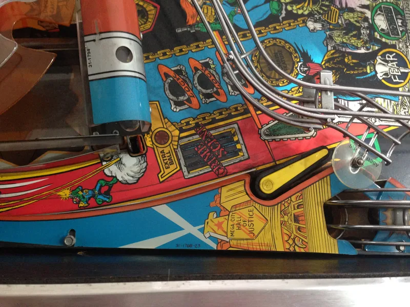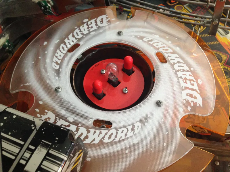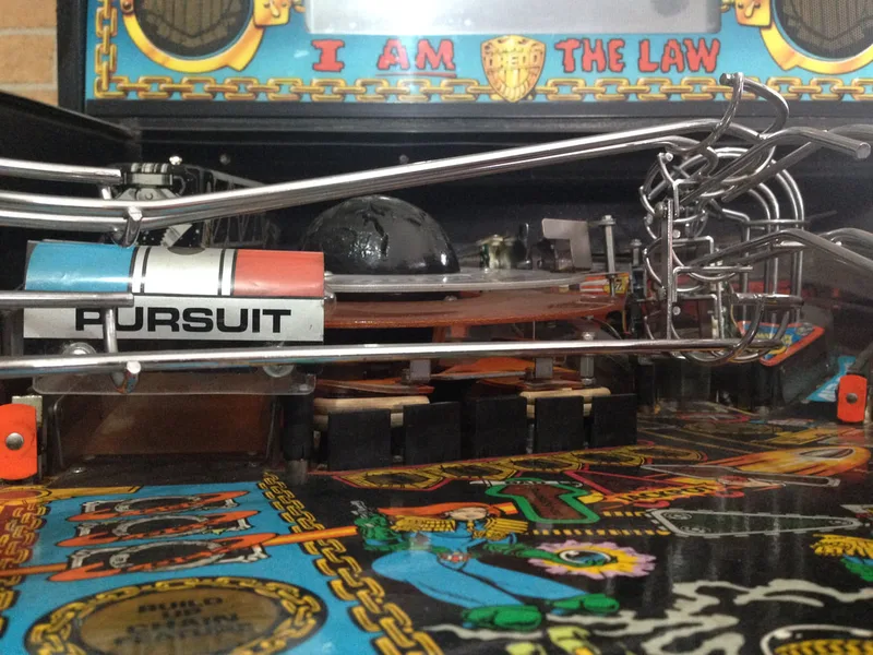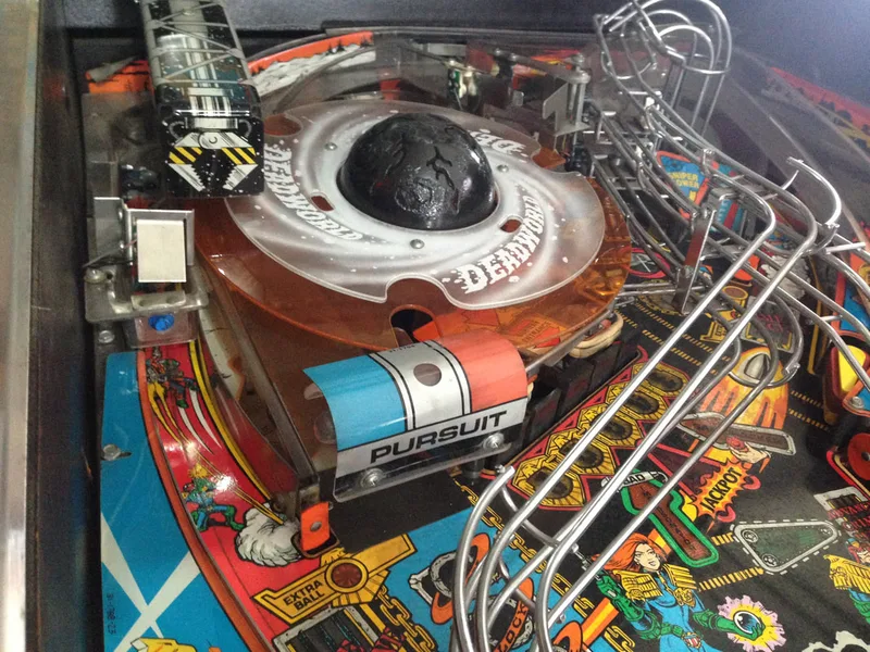 It's a cool mechanic that was apparently removed after one distributor raised concerns regarding the reliability of the mechanism. And like so many other cool pinball mechanism ideas, it was removed from the final game. However, all you need to restore the prototype Deadworld is a modified orange ring (with holes instead of cut-outs) and a game ROM programmed with the prototype Deadworld functionality. The most popular version of the mod is that sold by Pinbits. Installation is pretty easy and is covered fairly well in this guide and on Pinball News. I haven't installed this mod on my Judge Dredd yet, but may very well do so in the future, as it's damn cool.