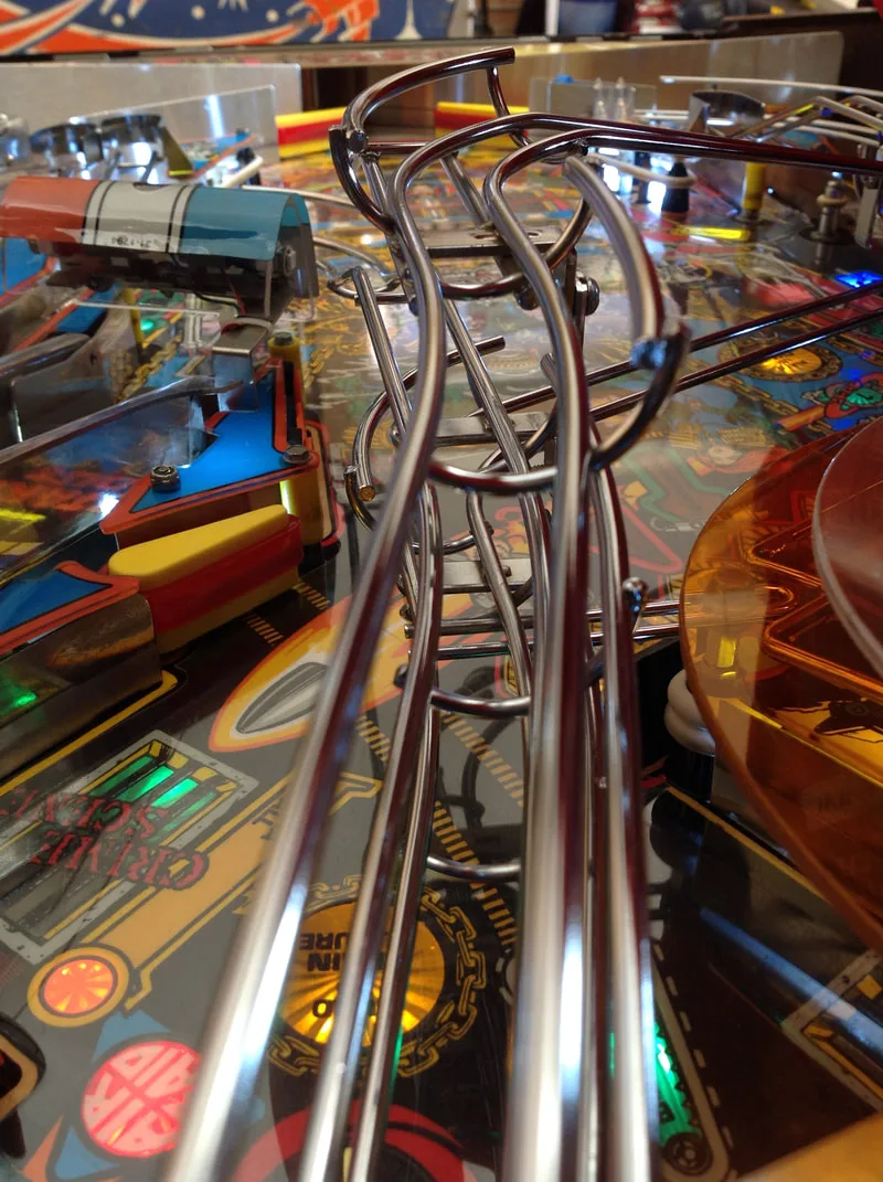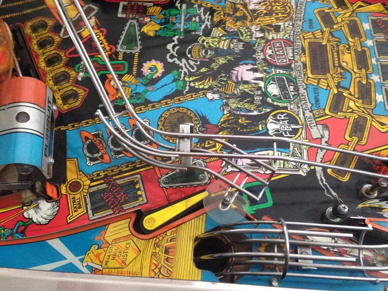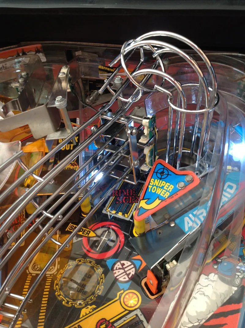 Judge Dredd has a lot going on on top of the playfield, so be sure to take more photos than normal when disassembling everything. The wireform ramps can be removed in one single piece. A very useful guide to refer to during disassembly is Adrian Cook's Judge Dredd shop-out guide. Take particular care on the underside of the playfield near the subway ramp. Things are packed in tight around this ramp, such as the lamp board and playfield wiring, so I found it easier to take most surrounding components off as well.
