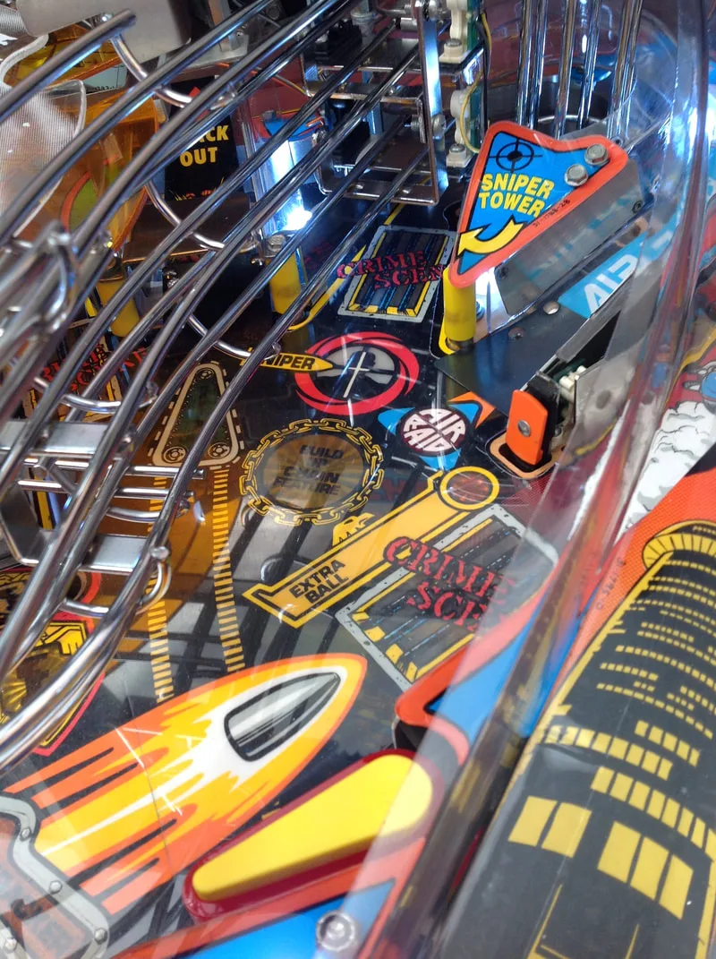 For LEDs, I installed colour-matched lamps in the inserts bought from Luke's Pinballs. Judge Dredd looks fantastic with some bright LEDs installed. However, I did not replace the incandescent globes used in the crime scene insert lamp boards. These are the ones that flash according to the crime scene level you reach in the game. These bulbs are flashed in sequence to create a strobe effect during gameplay, which makes it look like lights are flashing through the inserts, which have decals like barred windows. It's a really cool effect, but the LEDs don't reproduce it very well due to the fast speed at which they turn on. So it looks like incandescent globes do still have a place in pinball after all!