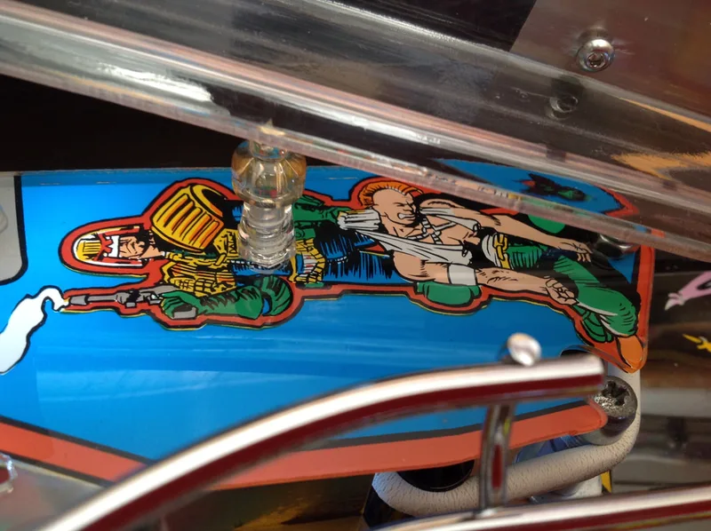 The Drain Shield insert on Judge Dredd was worn on the bottom right corner as a result of a slight raise in the insert causing balls to rub the artwork off. This section was mainly yellow and black, so it wasn't too hard for Fiona to touch up.