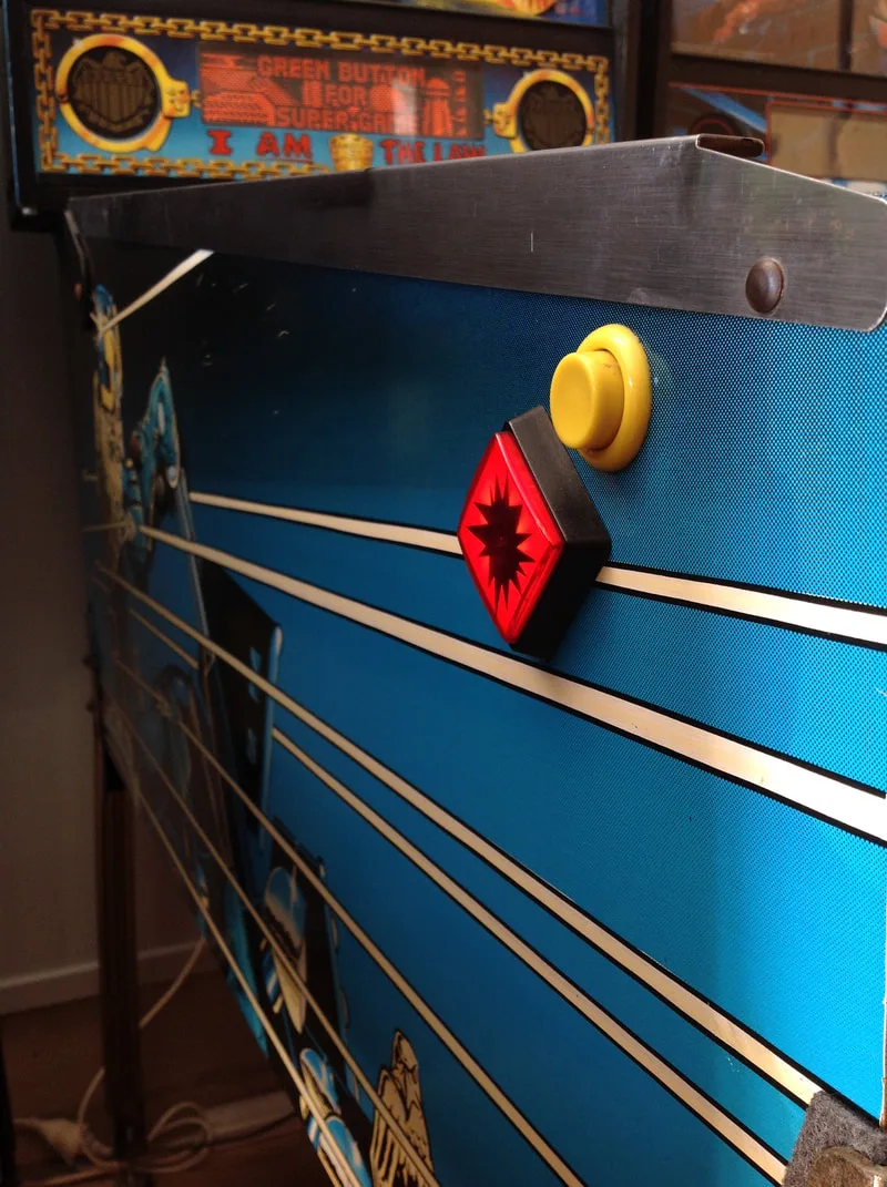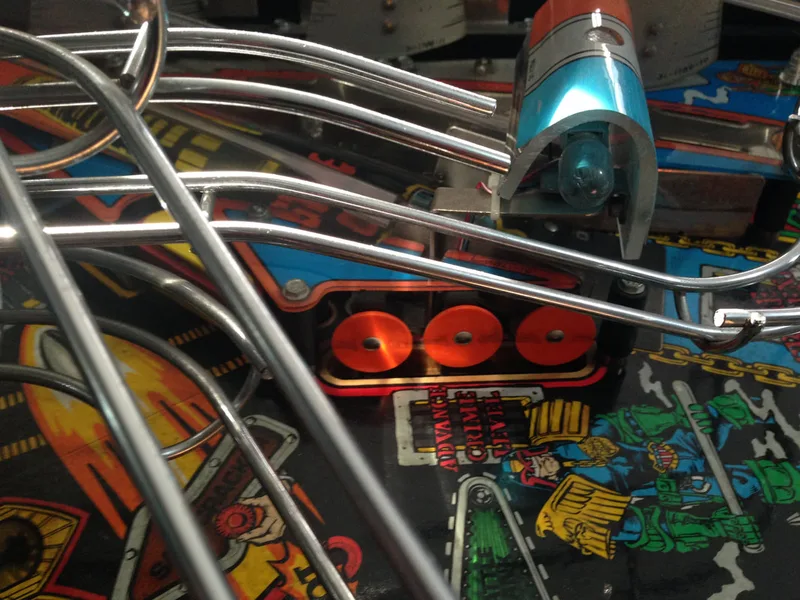 I installed yellow Cliffy post sleeves throughout the game. The flipper bats on Judge Dredd are yellow, so I ordered some red Super-Bands which look good on them. For rubber, I used white rings, but can totally understand why some people prefer black. White works well with the brighter colours on the playfield, but black also fits the theme well.