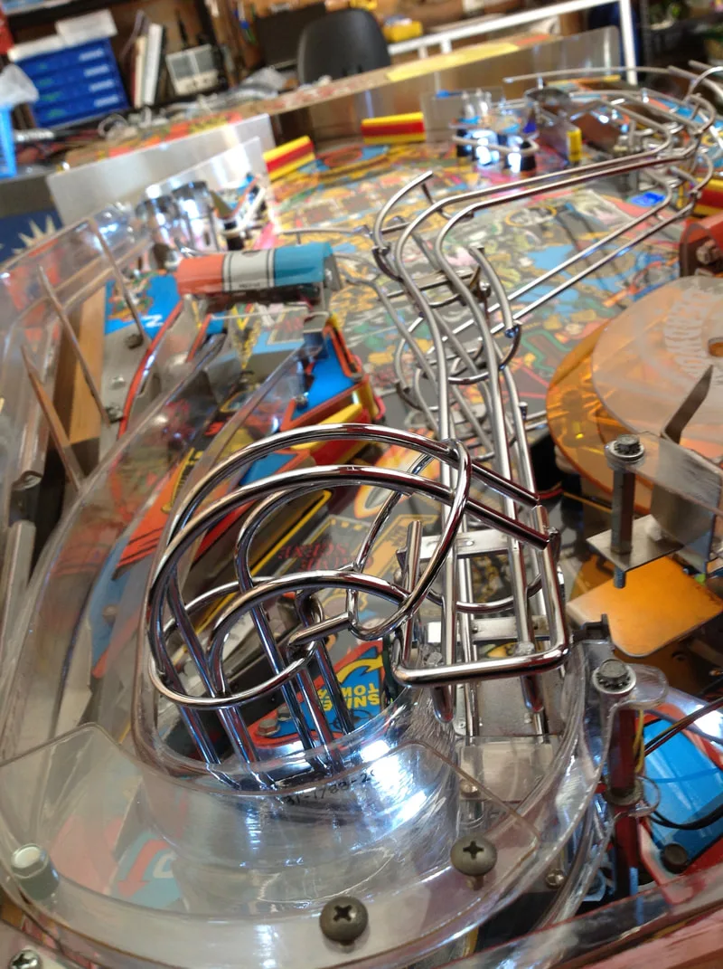 The curved plastic pieces, however, were both unoriginal. It looked like the previous owner had made up his own by bending some polycarbonate to shape. It actually looked really good, and the plastic was much thicker than the original, which means they will hopefully be more impact-resistant. I guess this is one of those rare instances where a pinball repair is actually done properly!