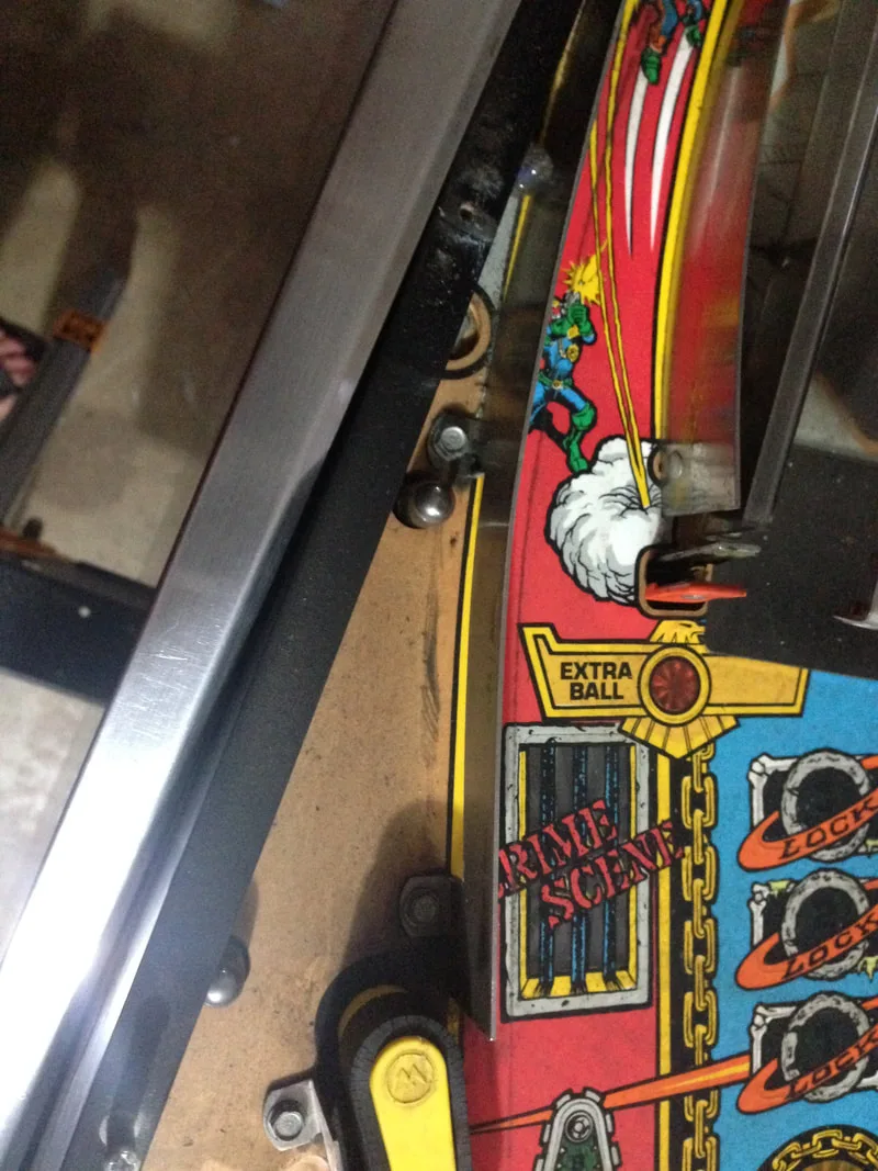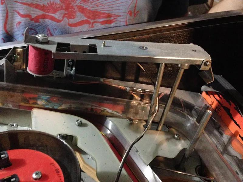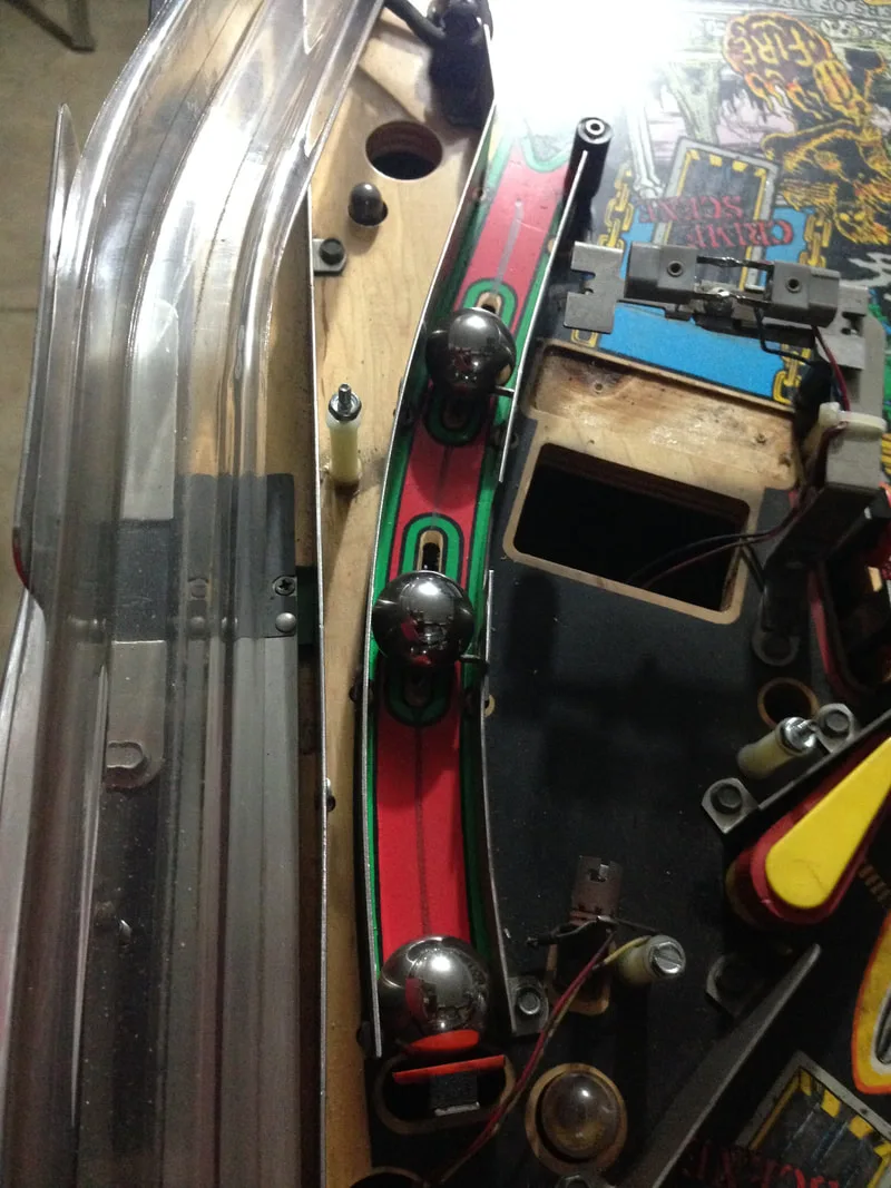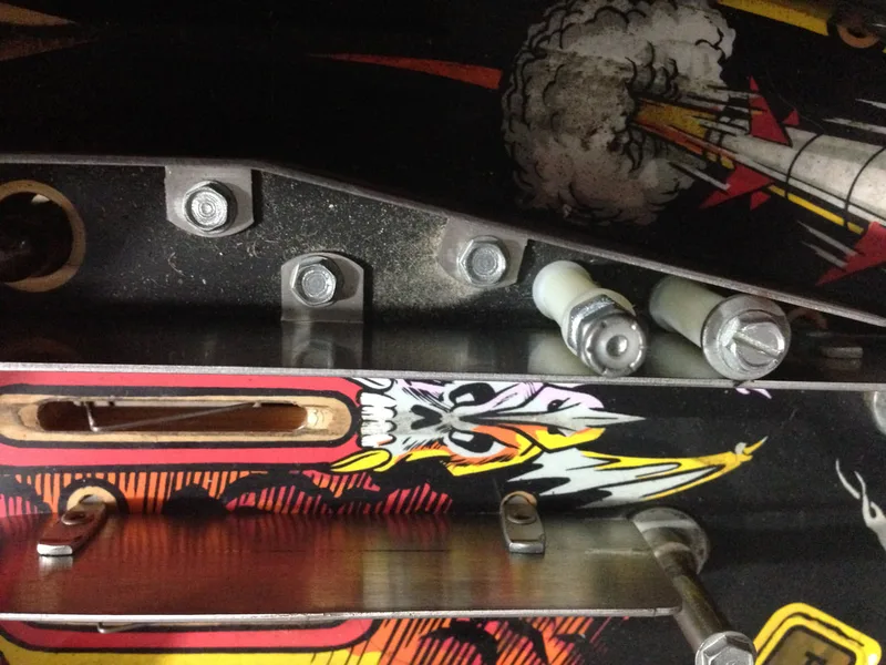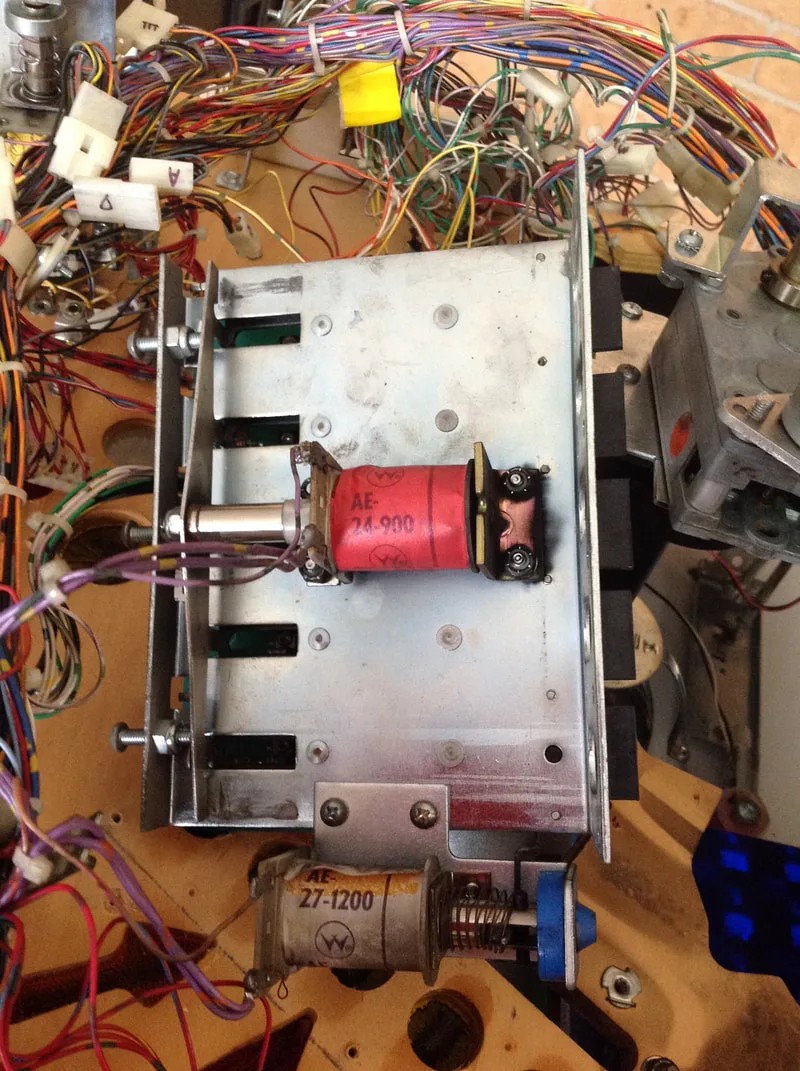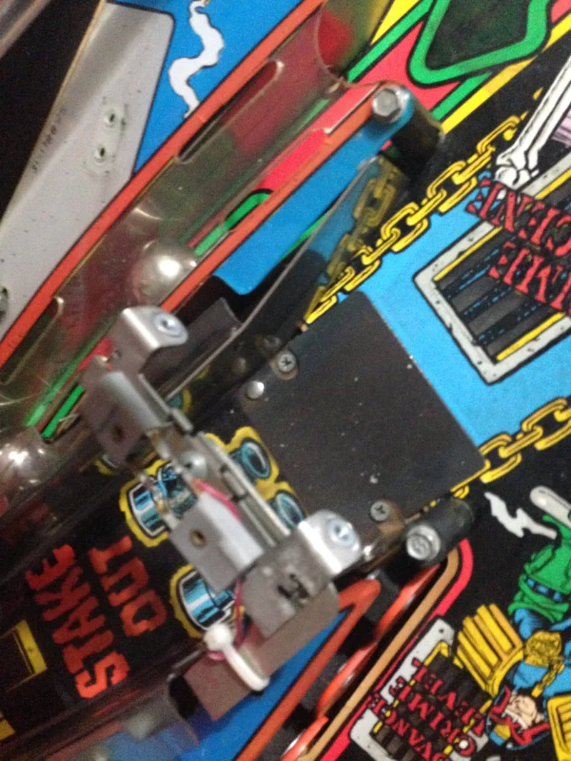 The assemblies on my game were not entirely original. The left mounting bracket was fine, but the one on the right had been snapped. The section of the bracket that screws onto the playfield had been replaced with another piece of metal which was riveted to the original, remaining piece. It worked well enough, and was mostly hidden under plastics, so there was no reason to replace it.