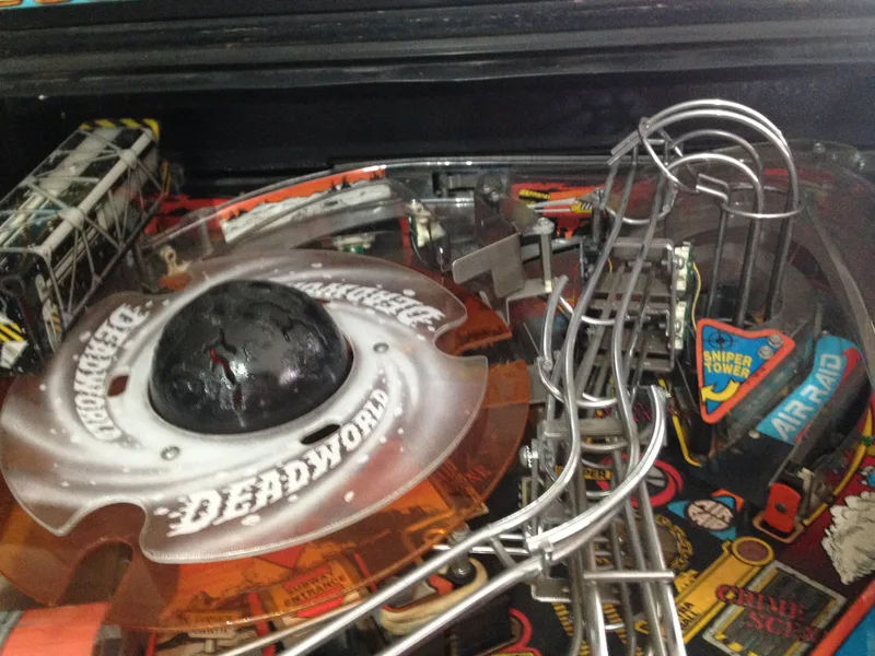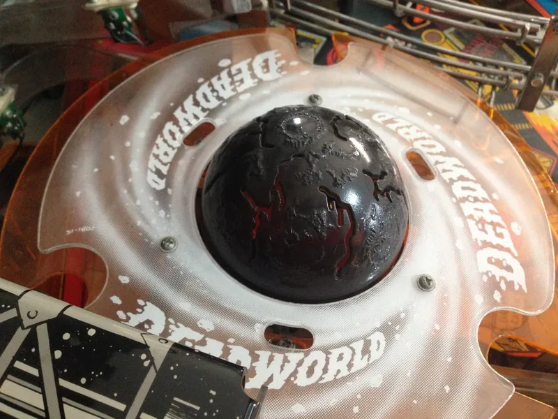 There is one main thing you can do to mod your Deadworld. In the original prototype game, the Deadworld actually held onto balls that were diverted into it (i.e. it held the balls as physical locks instead of virtual ones). So when you locked two balls, those two balls were held on the orange Deadworld ring (part no. 03-8867) while it was spinning around, until you locked the third ball. At that point the crane picked them all up and dropped them onto the playfield for multiball. Here's a video of the mechanism as it was originally designed: