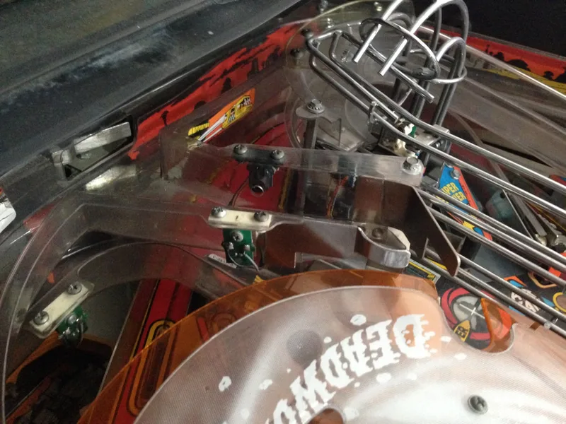 Under the playfield, you'll need to remove the lifter assembly (part no. A-17247). This screws into the playfield and the mounting bracket for the Deadworld motor. Once these screws are removed, you can pull the arm lifter assembly through the bottom of the playfield and remove it from the game. Don't forget to disconnect the lifter motor and the opto switch connectors, too.