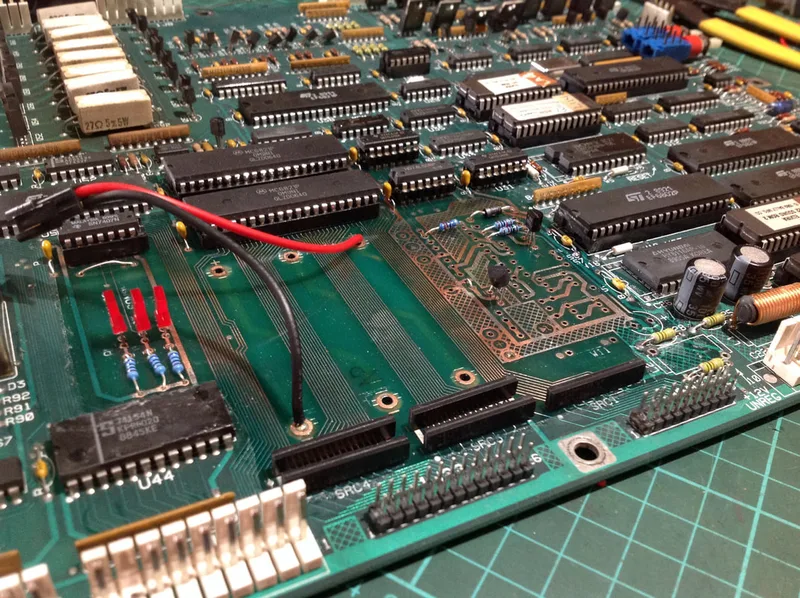 As for the component that originally caused all of this damage - the battery - I decided to install a remote AA battery pack. I would have preferred to use a coin battery holder, but unfortunately there are too many components too close to the battery area to mount a coin battery holder flush with the board. So, a remote battery pack was a good compromise. I used a small inline connector so the battery could be disconnected if necessary. Then it was time to finally test the board and see whether all of my hard work would finally pay off. The board only needs 5 volts to test the reset circuitry and boot. 12 volts is required for sound but is not necessary for the board to boot. You can hook up your external power supply to header 1J17 at the top of the board, with ground at pins 1-3, and 5 volts at pins 4-6.