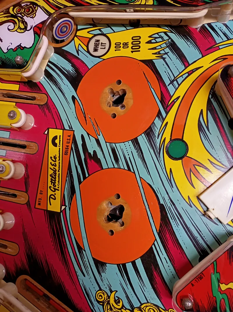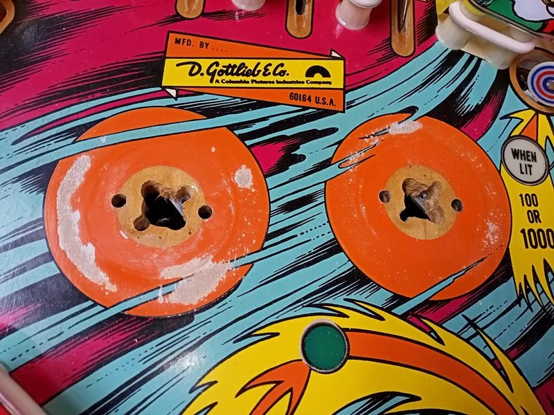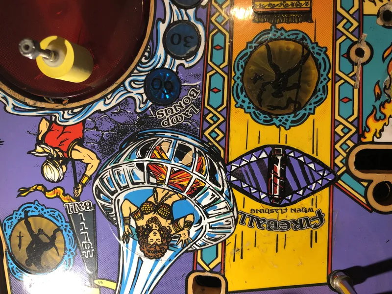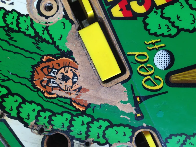 πΌοΈ On the other hand, I am able to repair playfield artwork to a standard that most pinball owners would consider acceptable for a fraction of the price of a full playfield restoration. So there are certainly more options for those who are restricted by budget but still want their playfield looking good. Below is a gallery of photos showcasing some of our playfield artwork repairs. These repairs were carried out using an airbrush, paintbrush, or combination thereof. No decals or overlays were used. New paint is covered with Mylar, a transparent clearcoat, or a plastic protector, to protect repaired areas. If you would like to have your playfield artwork repaired, please π¬ Contact Us to discuss the requirements of your specific repair.